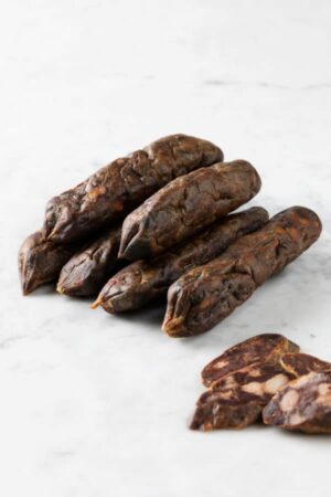 La nostra salsiccia di fegato viene ottenuta dal sezionamento di carni pregiate, quali: spalla, prosciutto e collo. Queste, insieme alla giusta percentuale di grasso e di fegato fresco, vengono miscelate e condite sapientemente con: alloro disidratato, pinoli sgusciati ed uva passa… Il mix di odori dona alla nostra salsiccia, al fine dei 20 giorni circa di stagionatura, un sapore incredibile che riporta indietro nel tempo…